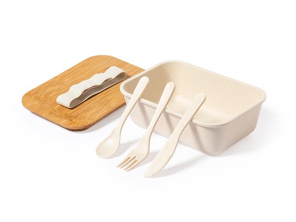 Boîte à lunch en PP grainé sans BPA, avec couvercle en bambou et capacité de 1l. Fermeture par sangle de sécurité élastique, avec compartiments pour fourchette, cuillère et couteau (inclus).