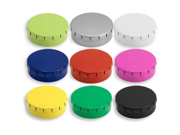 Description : Boîte en métal contenant environ 60 bonbons sans sucre à la menthe. Coloris disponibles : blanc, rouge, vert clair, bleu de cobalt, argenté, fuchsia, noir, vert, jaune. Conditionné dans un polybag. Max. taille de marquage: ? 35mm.