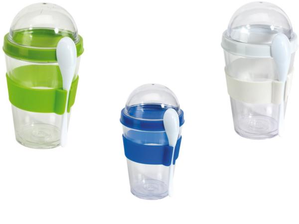 Bol à céréales: couvercle vissable pour remplir de céréales, bol transparent (contenance env. 350 ml) – idéal pour du yaourt – manchette en gomme avec passant pour la cuillère en plastique incluse.
