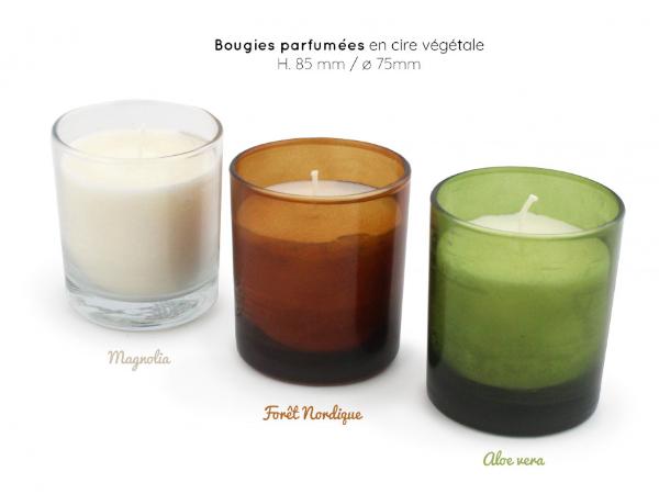 Contenant en verre de 75mm de diamètre et 85mm de hauteur, bougie parfumée 25h.