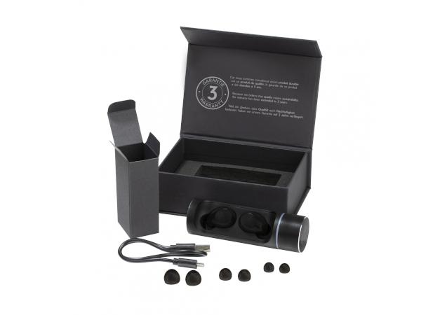 Lot de deux écouteurs sans fil recouverts d'une finition en caoutchouc. Qualité sonore optimale grâce à sa technologie BlueTooth 5.0 EDR (Enhanced Data Rate).
