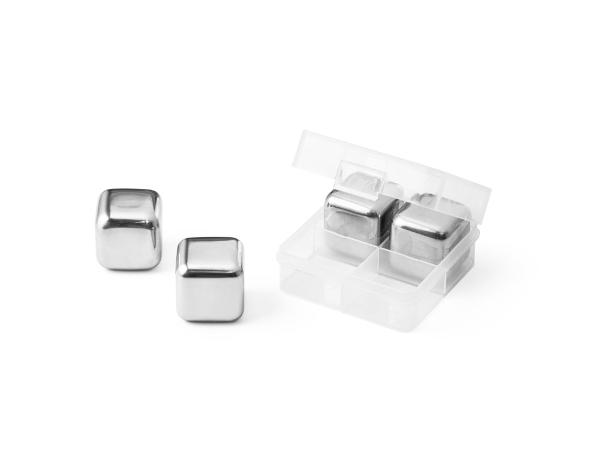 Jeu de quatre cubes réutilisables en acier inoxydable. Livré dans une boîte PP avec une protection en papier de type manchon.