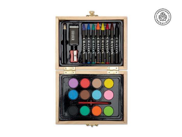 Accessoires de peinture présentés dans une mallette en bois, contenant 8 crayons de couleur, 12 peintures à eau, 1 pinceau, 1 taille-crayon, 1 gomme et 1 crayon.