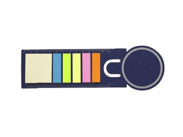 Marque-pages cartonné muni de blocs de papier repositionnables contenant chacun 16 feuillets d'une dimension de 4,5 x 1,2 cm et de 4 x 4,5 cm. Coloris disponibles : bleu, rouge, brun.
