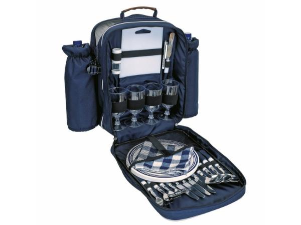 Sac-à-dos pique-nique pour 4 personnes avec compartiment isotherme, 2 étuis à bouteilles, couverts et verres à vin en plastique, couteau à fromage, tire-bouchon, serviettes de table, salière et poivrière et planche à découper.