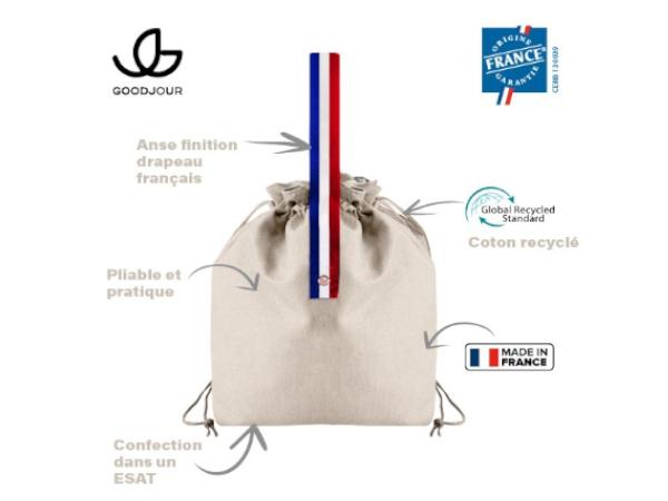 Ce sac pochon à la anse Bleu/Blanc/Rouge est Fabriqué en France avec des matériaux recyclés de qualité rPET, il dispose d’un cordon de serrage pour le fermer et garder la fraîcheur à l’intérieur.
