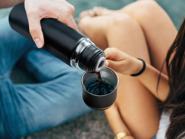 Set comprenant 1 gourde à double paroi en acier inoxydable, à vide isolant, avec bouchon étanche et 2 gobelets.