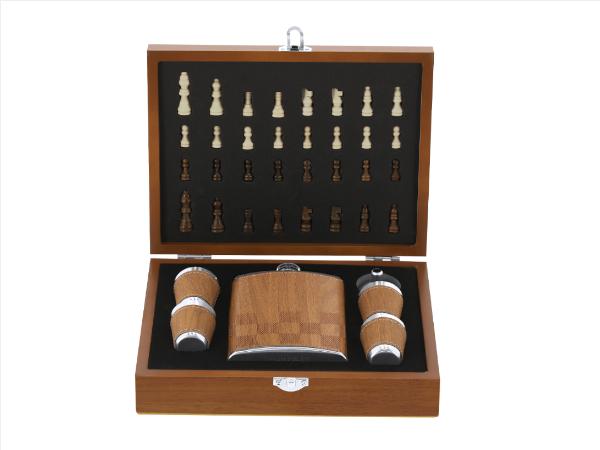 Set original de flasque avec finition en bois et design en forme d'échiquier.