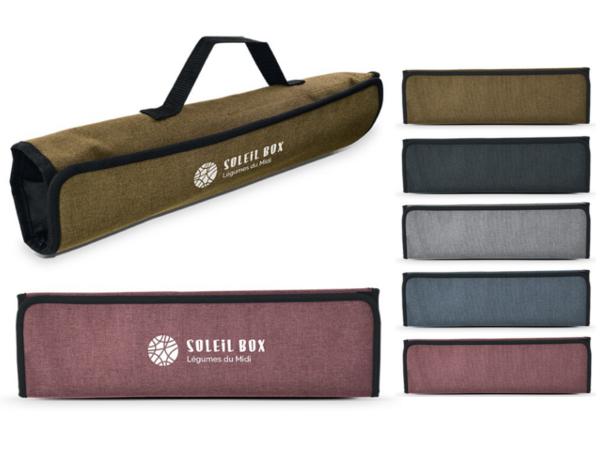 SET barbecue, aux coloris chinés très tendance, composé de 3 ustensiles de Barbecue tout métal protégés par un rabat avec oeillet de suspension et d'une poche zippée transparente.